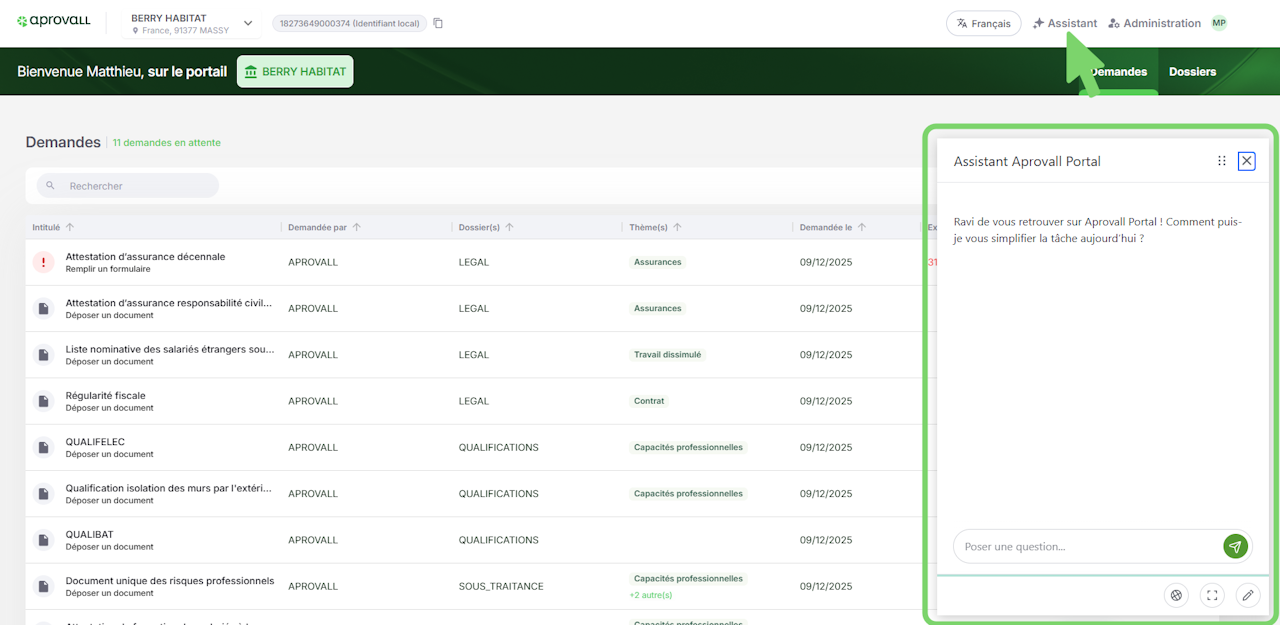 An assistant is available in the top right corner of the Aprovall Portal platform. It answers their questions based on the available guides and allows them to contact support if needed.